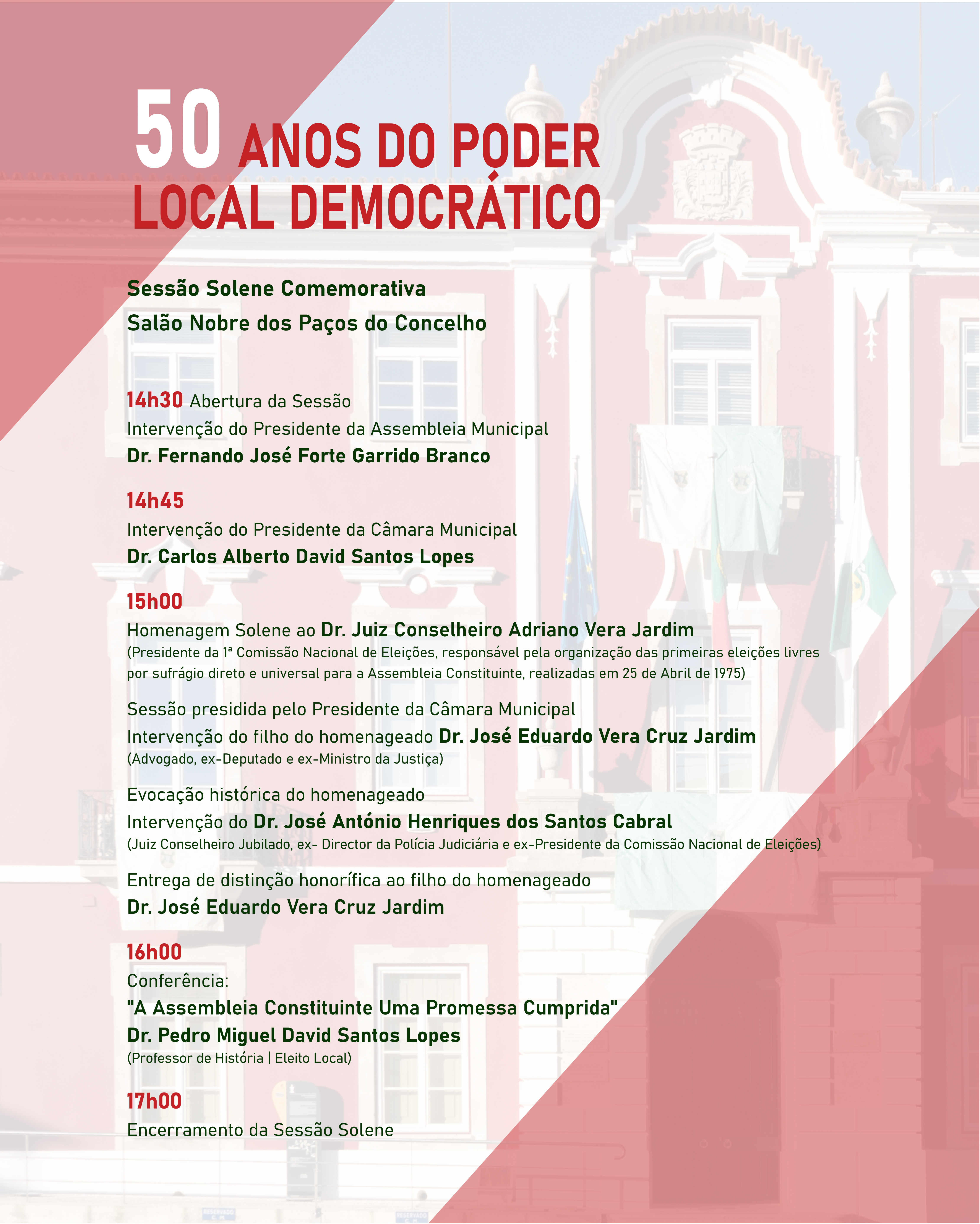 Um dos momentos centrais das comemorações terá lugar pelas 14h30, no Salão Nobre dos Paços do Concelho, com a realização da Sessão Solene Comemorativa dos “50 anos do Poder Local Democrático”. Este momento assinala meio século de poder local em Portugal, evocando o seu papel estruturante na consolidação da democracia e na afirmação de territórios mais próximos, participativos e comprometidos com o desenvolvimento das respetivas comunidades.