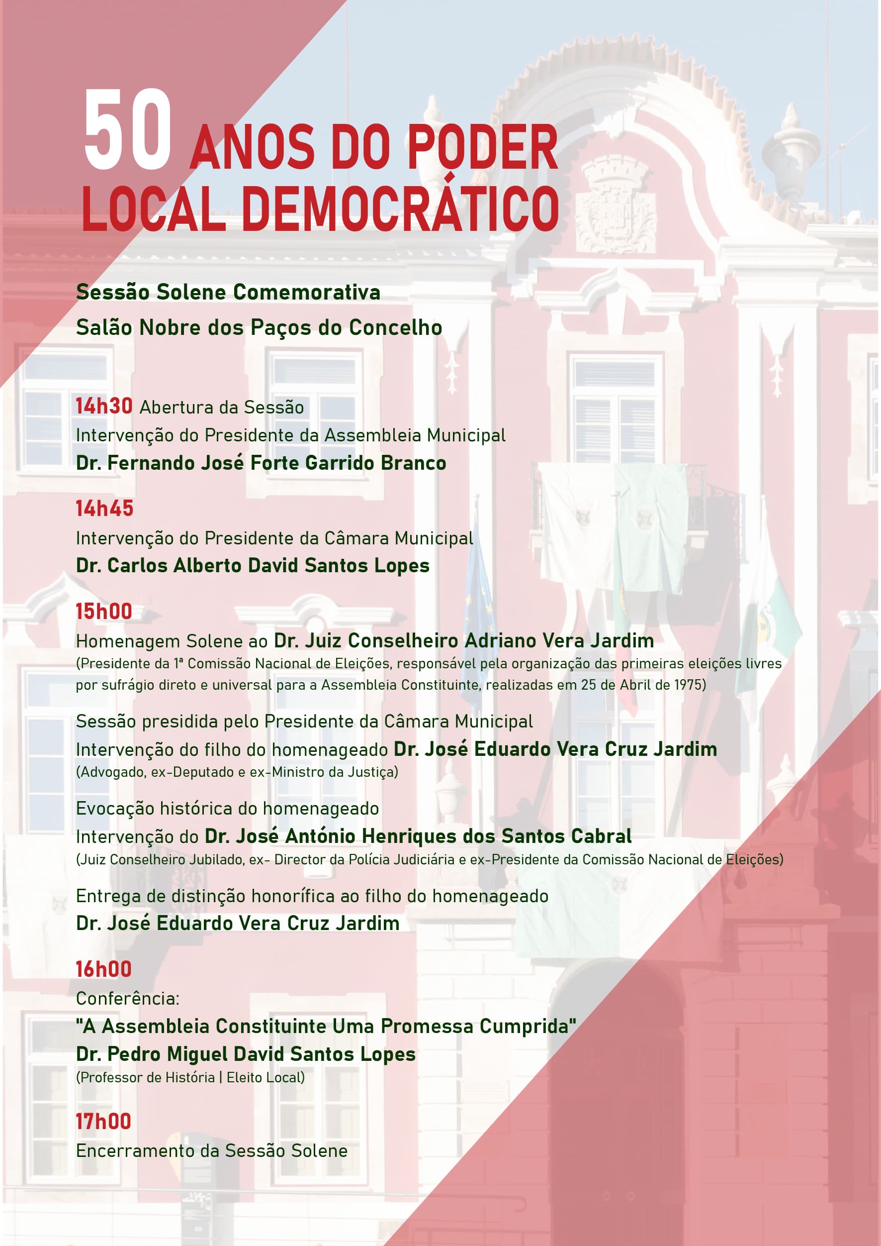 A cerimónia, inserida nas celebrações do 52.º aniversário da Revolução dos Cravos, terá lugar no Salão Nobre dos Paços do Município, pelas 14h30, e pretende, assim, comemorar e preservar na memória coletiva o nascimento formal do Poder Local Democrático, e o seu papel insubstituível na coesão nacional. Recorde-se que, após o 25 de abril e a deposição do regime ditatorial vigente, foi promulgada, a 2 de abril de 1976,a Constituição da República Portuguesa que consagrava o Poder Local Democrático, realizando-se a 25 de abril de 1976 as primeiras eleições para a Assembleia da República (em 25 de Abril de 1975 tinham sido as eleições para a Assembleia Constituinte) e a 12 de dezembro as primeiras eleições autárquicas.